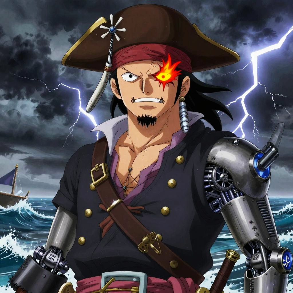 One piece ai generator, a close-up of a charismatic pirate captain with fiery eyes and a mechanical arm, detailed anime art, mixed traditional pirate clothing and futuristic elements, stormy sea background with lightning, high contrast and dramatic lighting