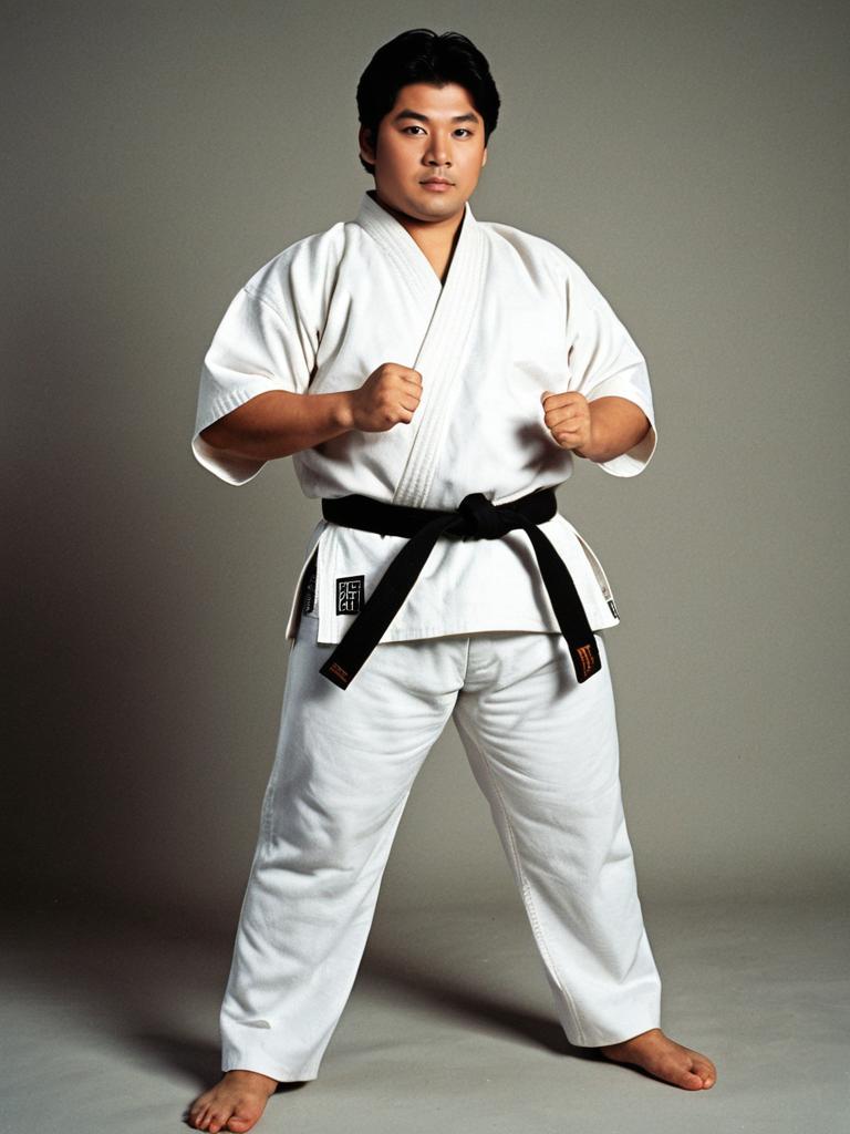 Plus size man karate kid san, 1boy, male focus, solo, dougi, black hair, standing, full body, belt, martial arts belt