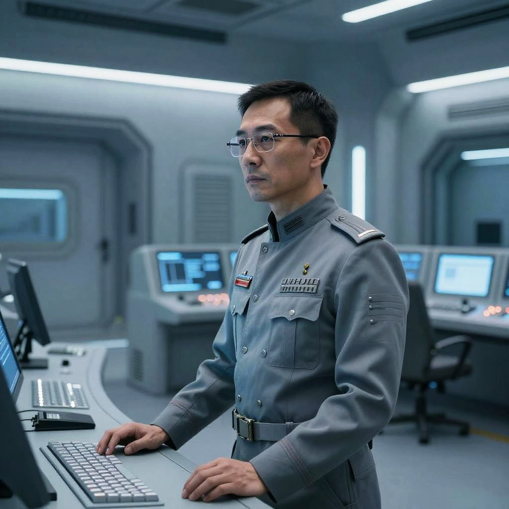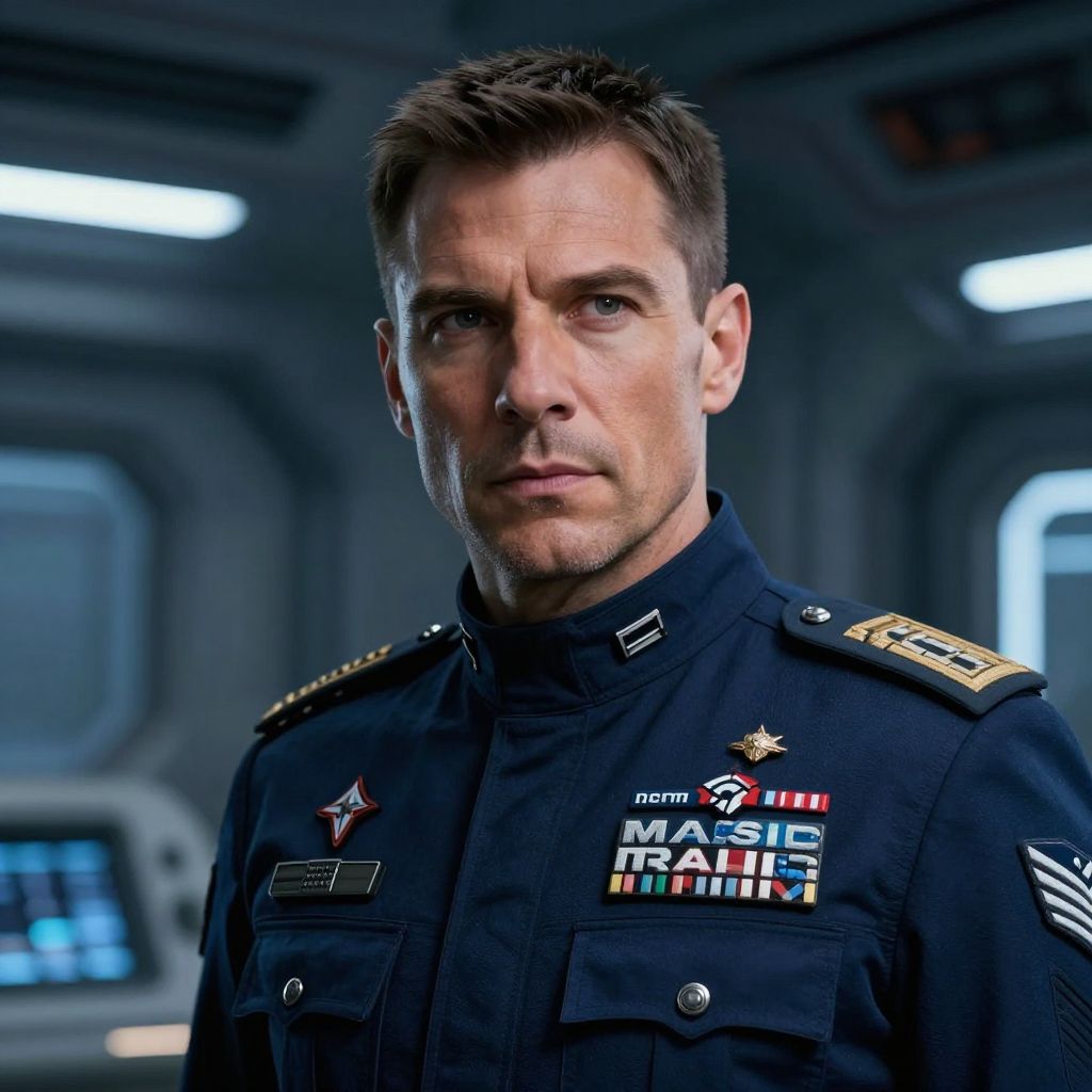 Photograph of a serious-looking white male in his 40s with short, dark brown hair, wearing a dark navy blue military uniform adorned with various ribbons, medals, and insignias. His uniform includes gold shoulder epaulets and a high collar. He has a clean-shaven face and blue eyes. The background is a dimly lit, futuristic spaceship interior with metallic walls and blurred control panels. The lighting highlights his face, casting soft shadows. The overall mood is intense and authoritative. The image is highly detailed and realistic, emphasizing his military rank and stature.