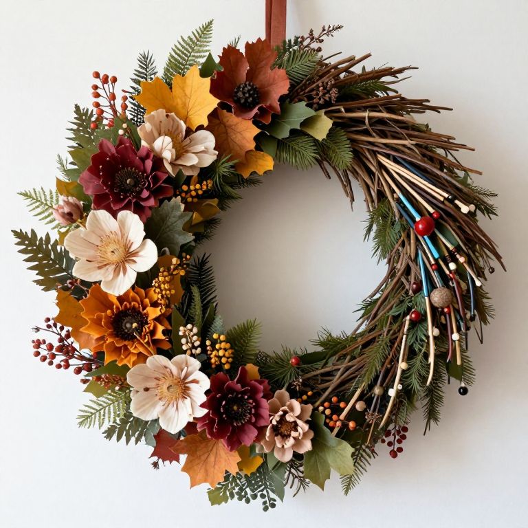 Photograph of a colorful, rustic wreath adorned with autumn flowers, pine needles, and feathers, hanging against a white background.