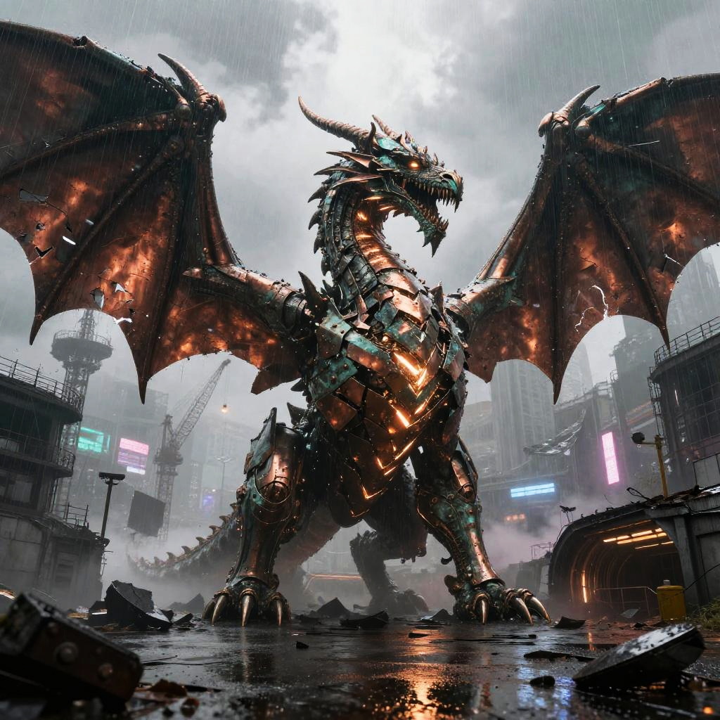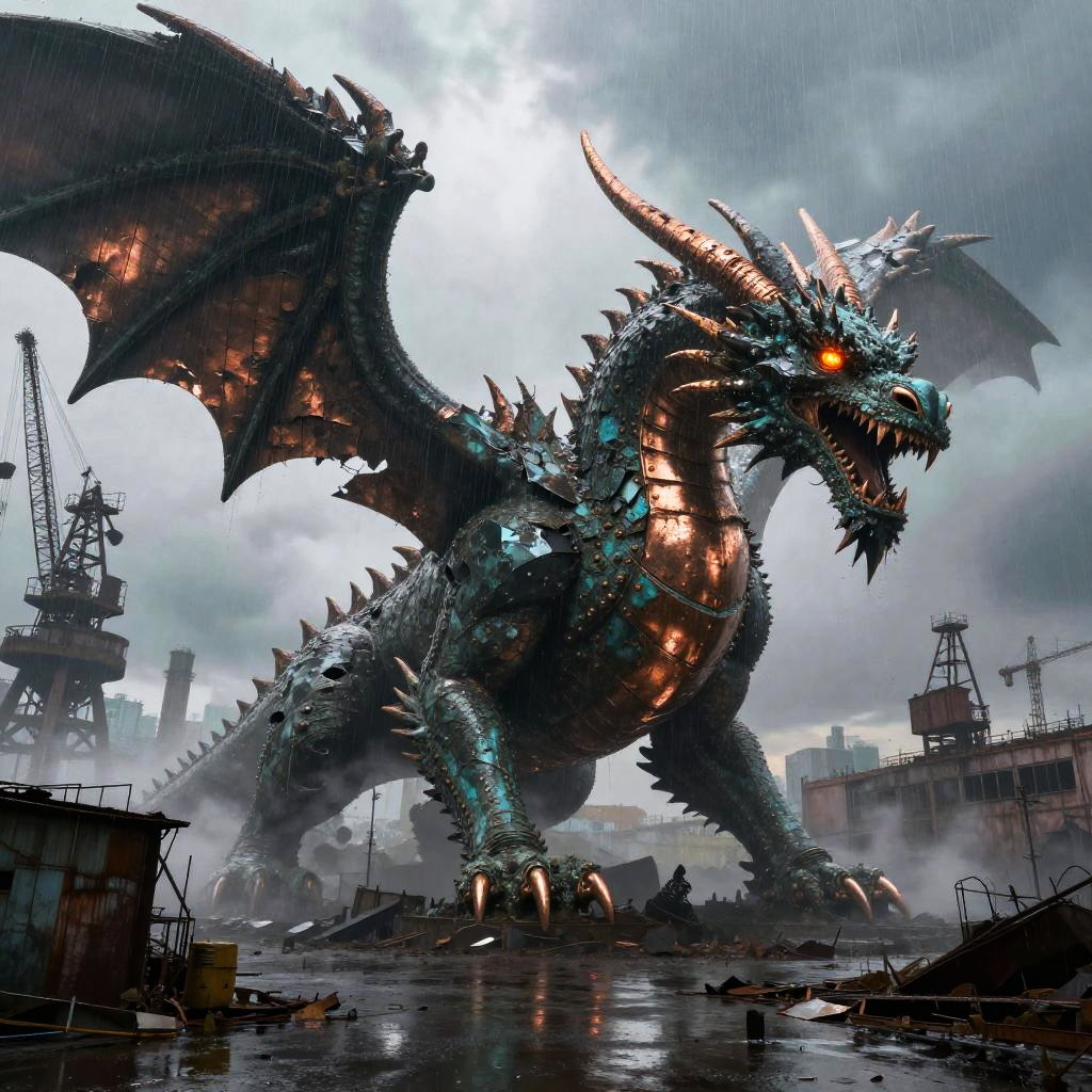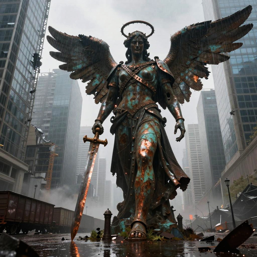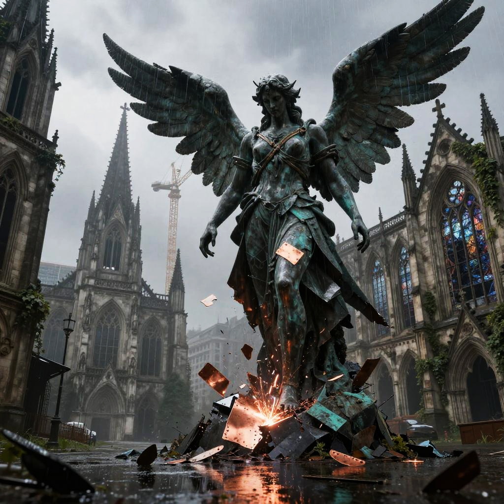 Best quality, masterpiece, hyperrealistic, ultra photorealistic; fantasy concept art, cover art; towering iron cathedral with stained glass windows shattered by storm; copper plate forging, verdigris patina, bent rivets, some plates torn away, yet the majesty remains; cinematic low-angle from below; shabby city infrastructure, rain-slick streets, reflective puddles, distant cranes; noon rain with mist, god rays through clouds; extremely detailed textures, 8k, volumetric light, rim light, soft shadows, global illumination, depth of field, filmic color grading; tempestuous harbor skyline with lightning flashing over twisted cranes in the background; romantic-gothic, tempestuous, luminous, wistful, painterly, cinematic, awe-struck