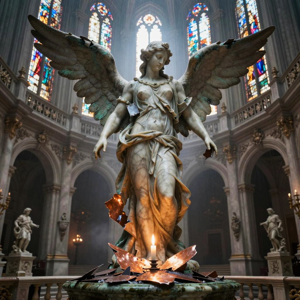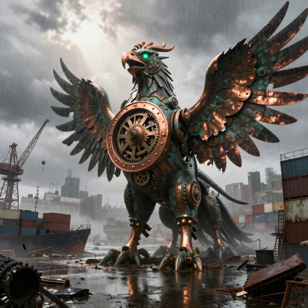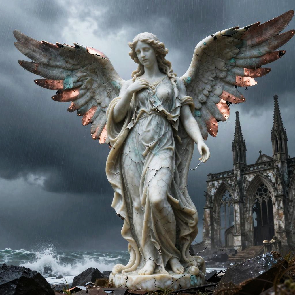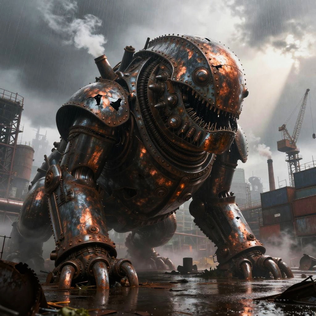 Best quality, masterpiece, hyperrealistic, ultra photorealistic; fantasy concept art, cover art; towering iron cathedral with stained glass windows shattered by storm; copper plate forging, verdigris patina, bent rivets, some plates torn away, yet the majesty remains; cinematic low-angle from below; shabby city infrastructure, rain-slick streets, reflective puddles, distant cranes; noon rain with mist, god rays through clouds; extremely detailed textures, 8k, volumetric light, rim light, soft shadows, global illumination, depth of field, filmic color grading; tempestuous harbor skyline with lightning flashing over twisted cranes in the background; romantic-gothic, tempestuous, luminous, wistful, painterly, cinematic, awe-struck