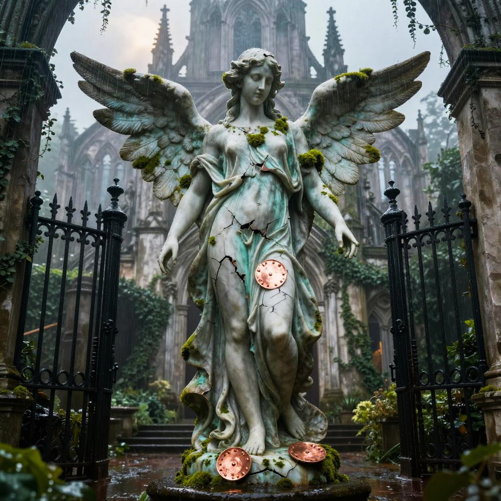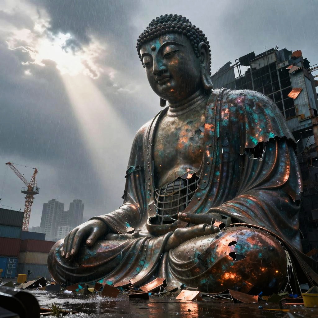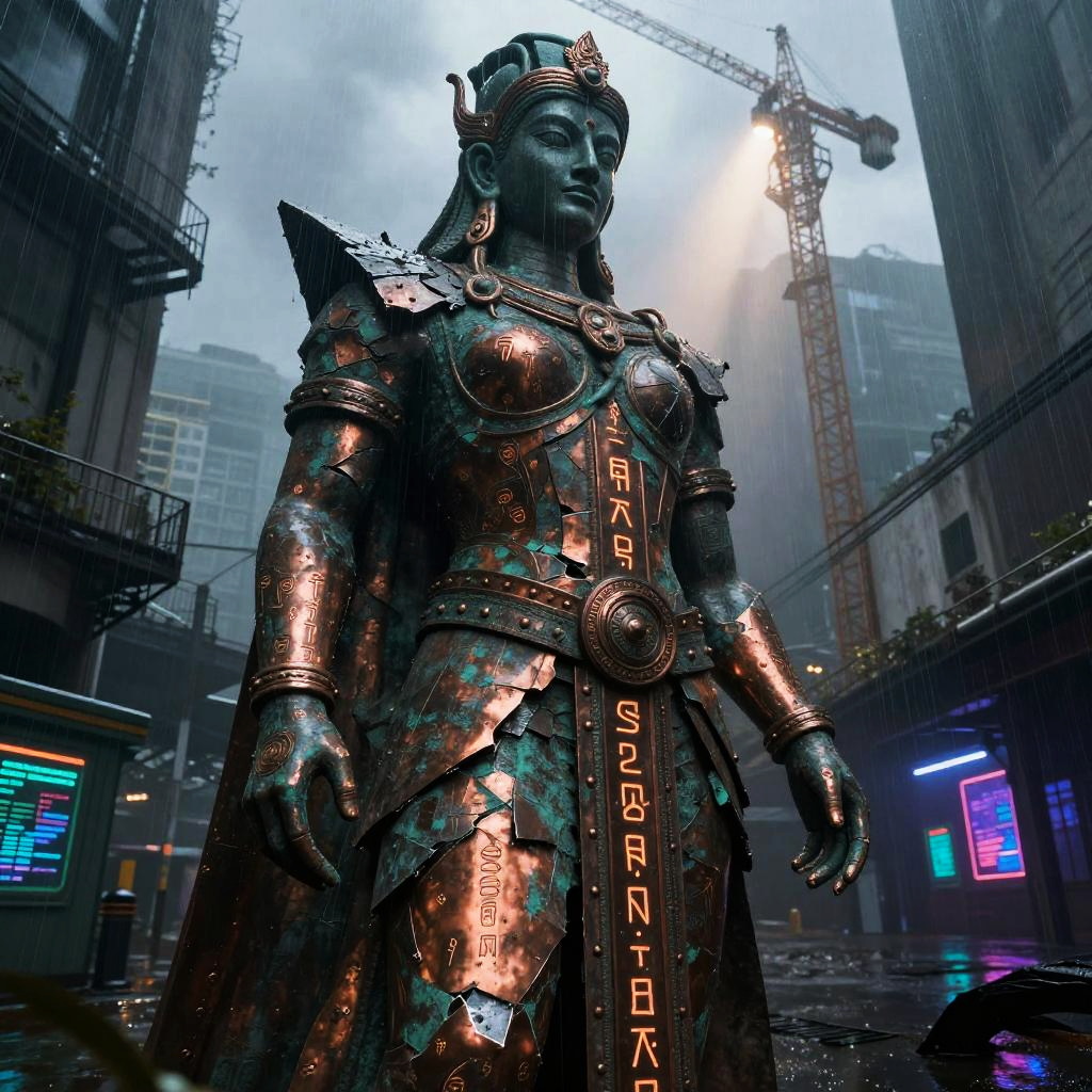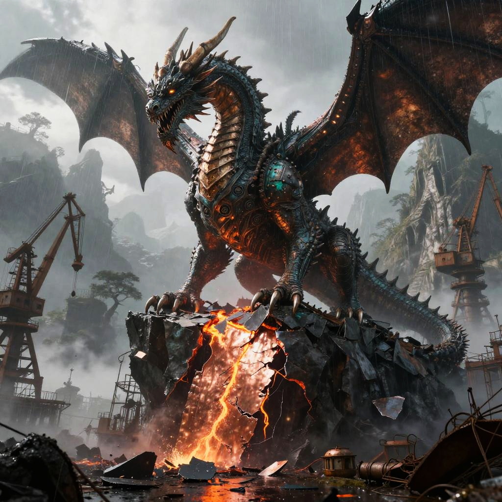 Best quality, masterpiece, hyperrealistic, ultra photorealistic; fantasy concept art, cover art; towering iron cathedral with stained glass windows shattered by storm; copper plate forging, verdigris patina, bent rivets, some plates torn away, yet the majesty remains; cinematic low-angle from below; shabby city infrastructure, rain-slick streets, reflective puddles, distant cranes; noon rain with mist, god rays through clouds; extremely detailed textures, 8k, volumetric light, rim light, soft shadows, global illumination, depth of field, filmic color grading; tempestuous harbor skyline with lightning flashing over twisted cranes in the background; romantic-gothic, tempestuous, luminous, wistful, painterly, cinematic, awe-struck