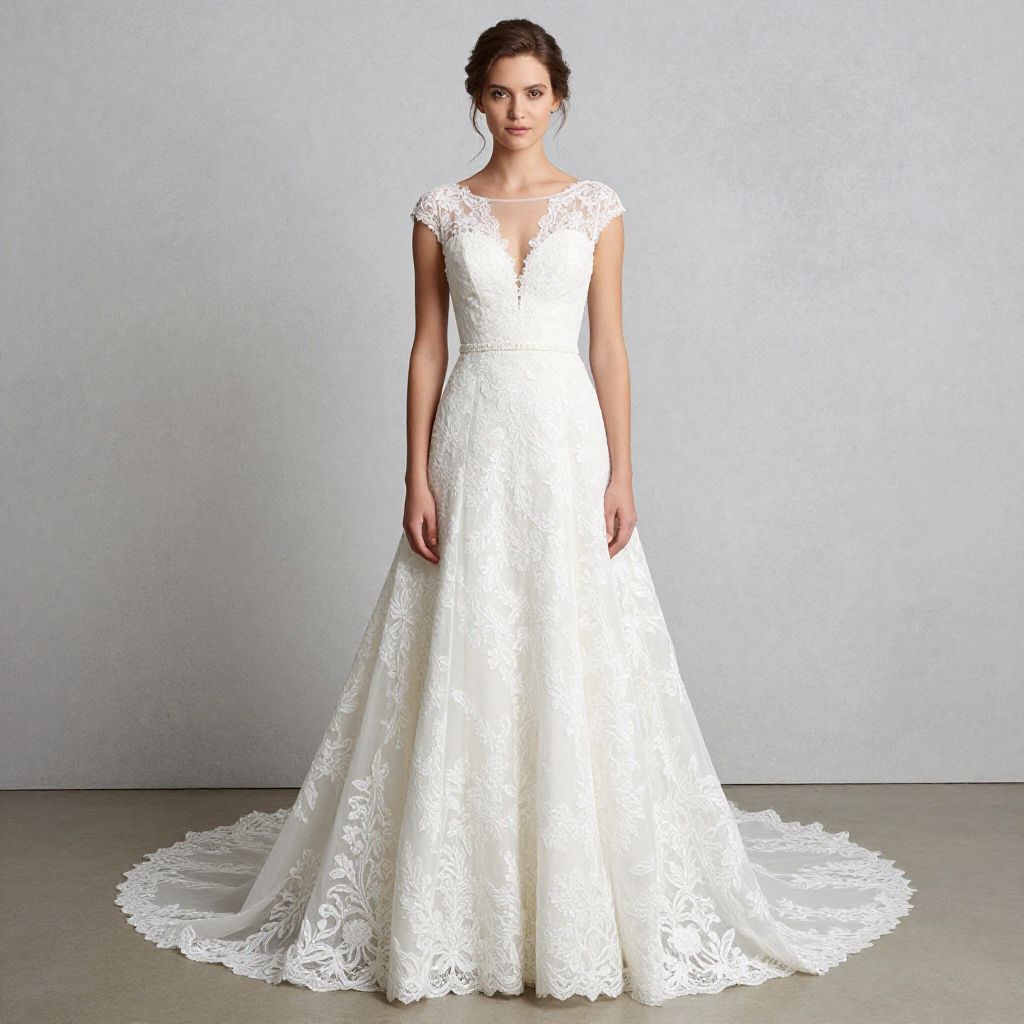 Photograph of a young woman with fair skin and dark brown hair in an elegant, white, lace wedding dress. The dress has a high, lace neckline and cap sleeves, with a fitted bodice that flares out into a full, trailing skirt adorned with intricate lace patterns. She stands against a plain, light gray background with a minimalistic, concrete floor. Her hair is styled in a simple, loose updo. The dress's lace texture is delicate and detailed, adding a timeless, romantic feel to her appearance. She gazes directly at the camera with a neutral expression.