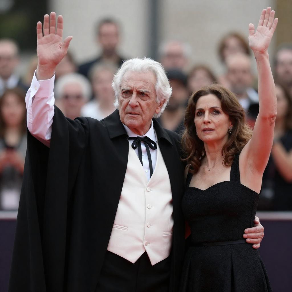 Photograph of an elderly man with white hair in a black cape and white vest, standing beside a woman with brown hair in a black dress, raising her arms. Blurred crowd in the background. Intense expressions on both faces.