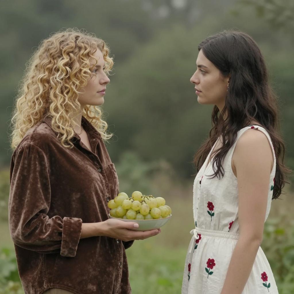 Two women standing outdoors, facing each other. Woman on left has curly blonde hair, wearing brown velvet shirt, holding small bowl with yellow-green grapes. Woman on right has long dark hair, wearing sleeveless white dress with red flowers, looking at the other. Background shows green, misty forest. Both women have neutral expressions.