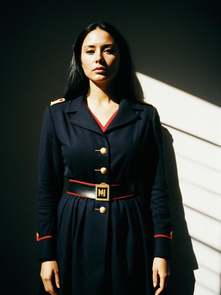 Woman in Mia costume, waist-up editorial portrait, dramatic shadows