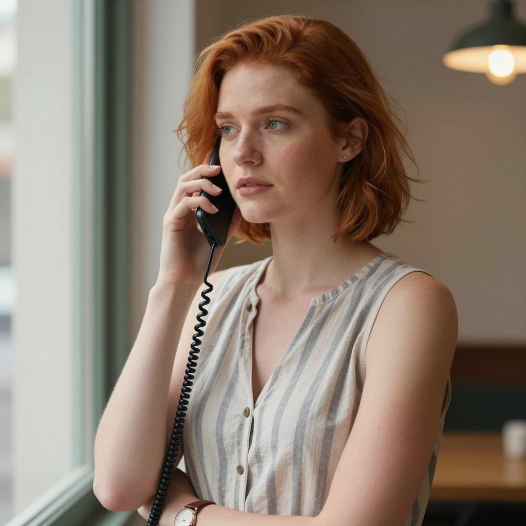 Woman with red hair lying on a bed, wearing a dark gray satin nightgown with black lace trim. She holds a black rotary phone to her ear with her right hand, resting on a patterned gold and green bedsheet. Dark green pillows are on either side of her. Her left hand is on her stomach. A silver watch is on the bed near her left hand. She has a neutral expression. Overhead view.