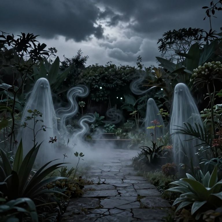 Dark, moody photograph of a foggy garden at night, featuring three ghostly, translucent figures with swirling mist, surrounded by dense, shadowy
