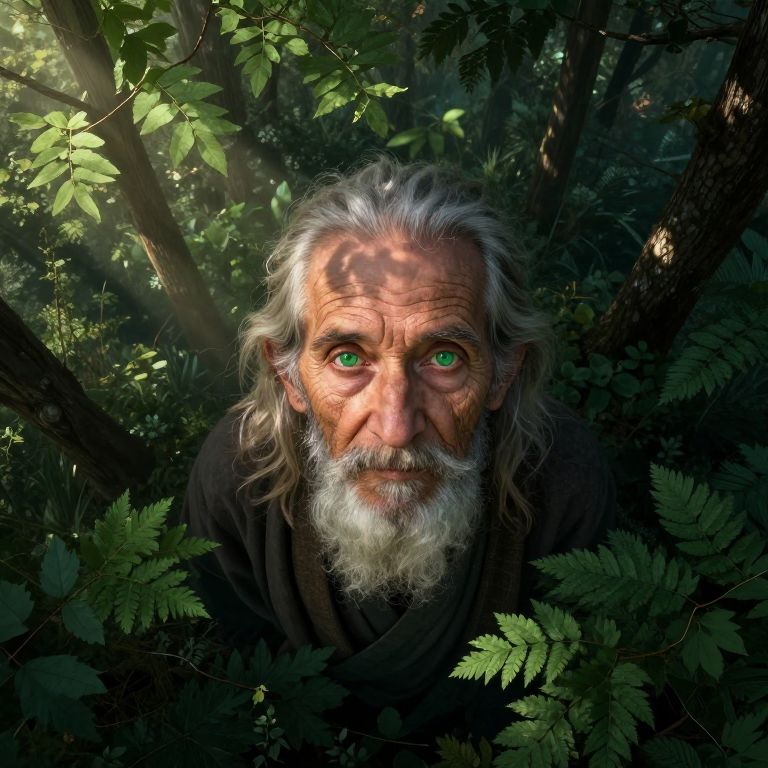 Photograph of an elderly man with a long, white beard and piercing green eyes, surrounded by dense, shadowy forest foliage. Sunlight filters through the leaves, creating dappled light patterns on his weathered face and wild, gray hair. He wears a dark, simple shirt, blending into the background. The man's intense gaze is directed at the camera, his expression a mix of wisdom and mystery. The rich green leaves and dark tree trunks frame him, adding to the sense of being deeply immersed in nature. The overall mood is both enchanting and slightly eerie.