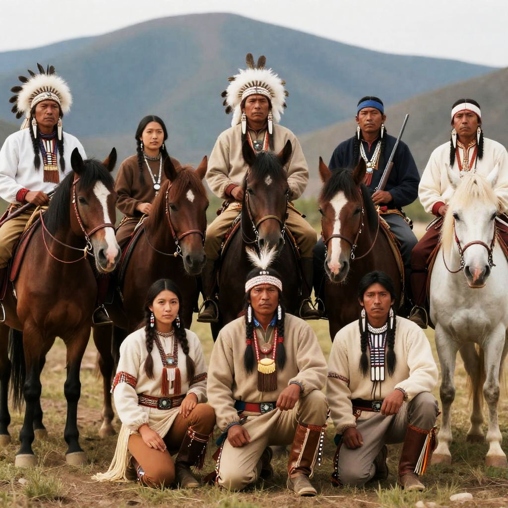 Photograph of a Native American leader with long braided hair, wearing a beige fringed jacket and striped shirt, leading a group of warriors on horseback. Background includes grassy plain, overcast sky. Warriors hold spears and guns, some wear feathers and red leg bands. Leader's intense expression, warriors' focused expressions. Group of 7-8 people. Horses in background. Leader in foreground, slightly crouched.