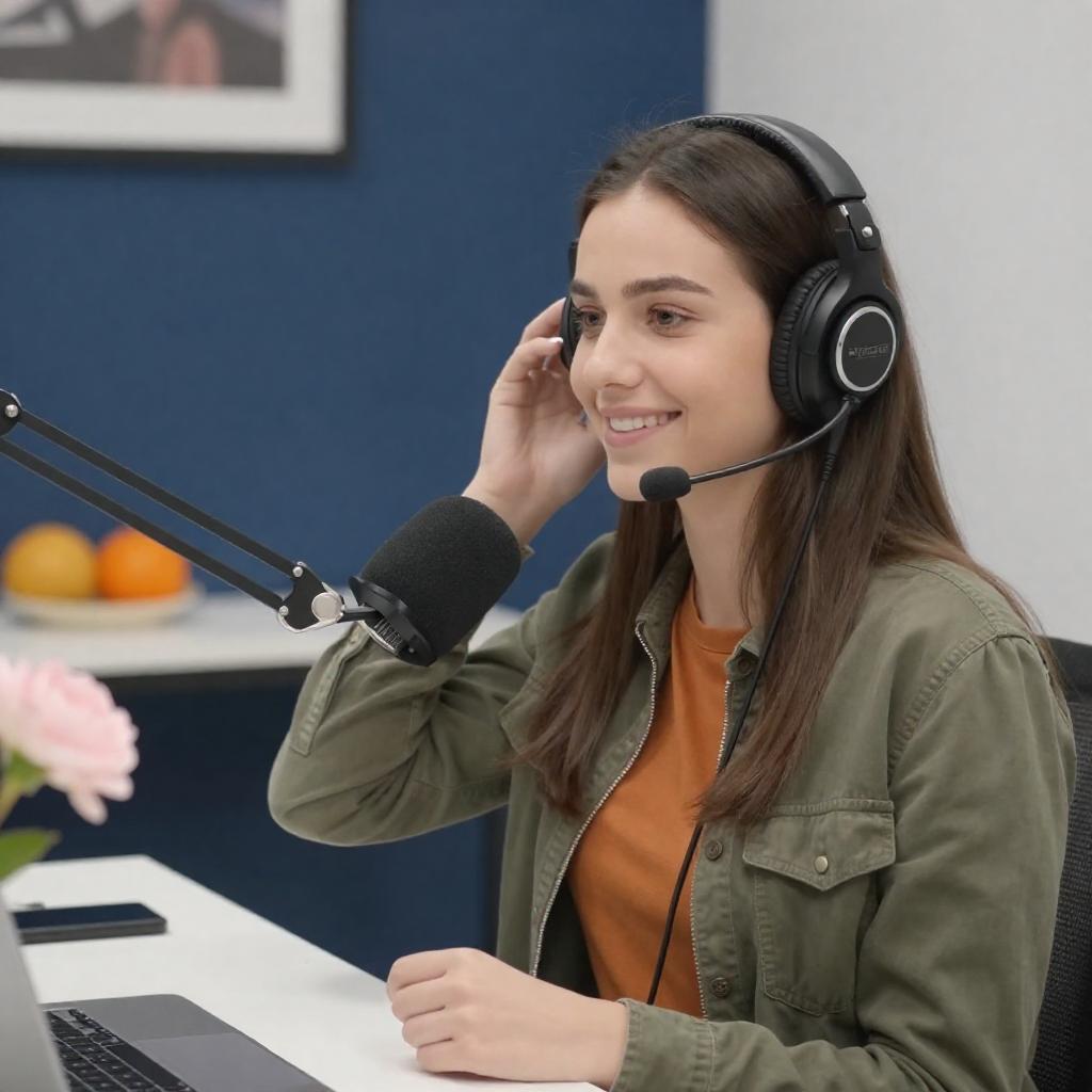 Young woman with long brown hair, wearing a headset, gray beanie, olive jacket, and orange shirt, smiles while adjusting a microphone. She sits at a desk with various recording equipment. Background includes a red couch, blue walls, and framed pictures.