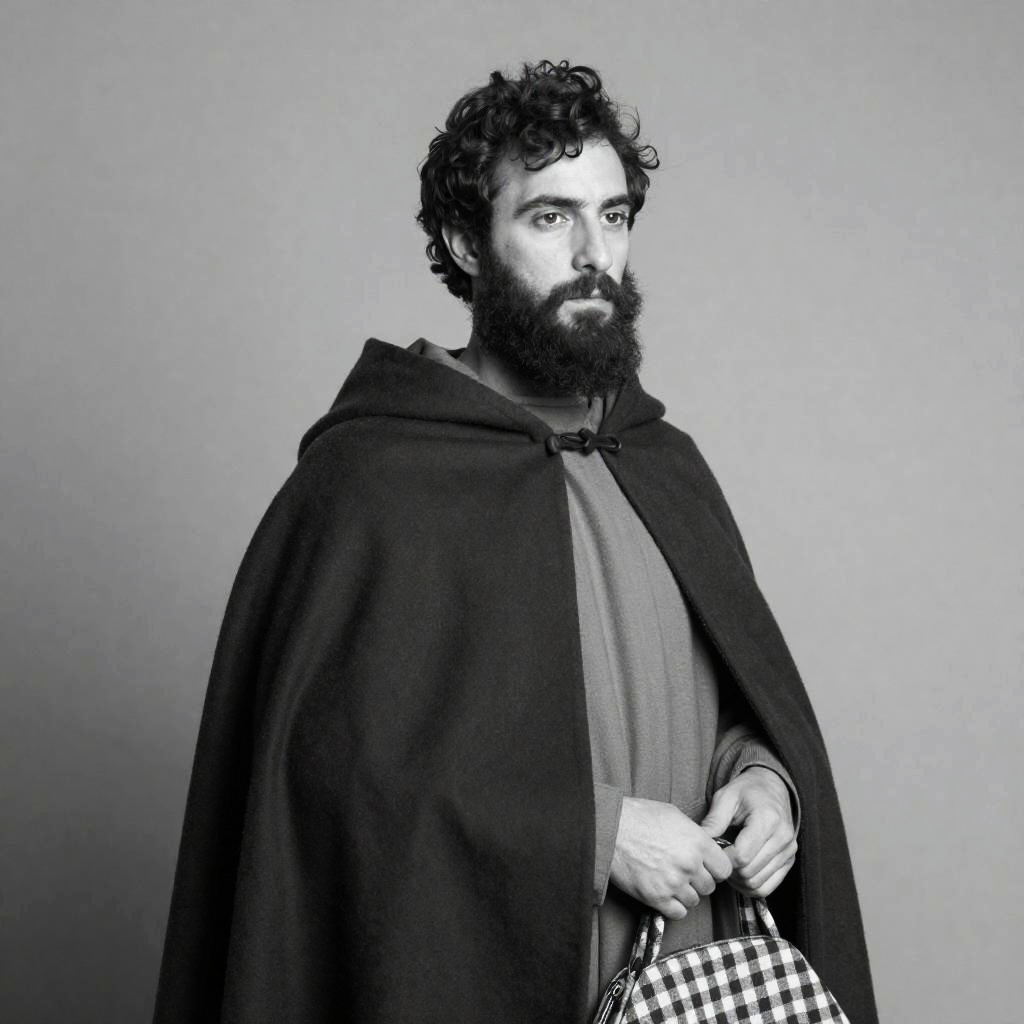 Black-and-white photograph of a bearded man with dark, wavy hair, wearing a dark, draped cloak over a light-colored garment. He holds a plaid bag in his left hand. His gaze is directed to the right, with a serious expression. Plain background. Man centered, upper body visible, slightly tilted to the left.