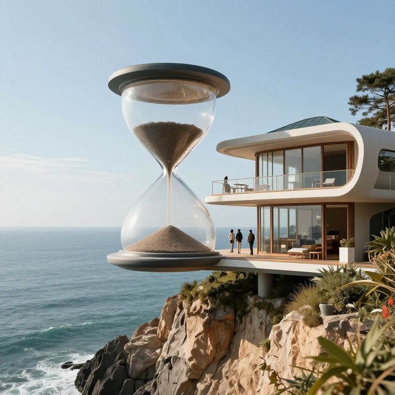 This digital artwork depicts a modern, two-story house with a distinctive, futuristic design, perched on a rocky cliff overlooking a vast, calm ocean under a clear blue sky. The house features large, curved glass windows and a sleek, white facade. To the left of the house, a massive, transparent hourglass floats in mid-air, with sand slowly moving from the bottom to the top. Two small human figures stand on the house's elevated balcony, gazing at the hourglass. The foreground includes green plants and rocks, while the background showcases the expansive ocean and clear sky.