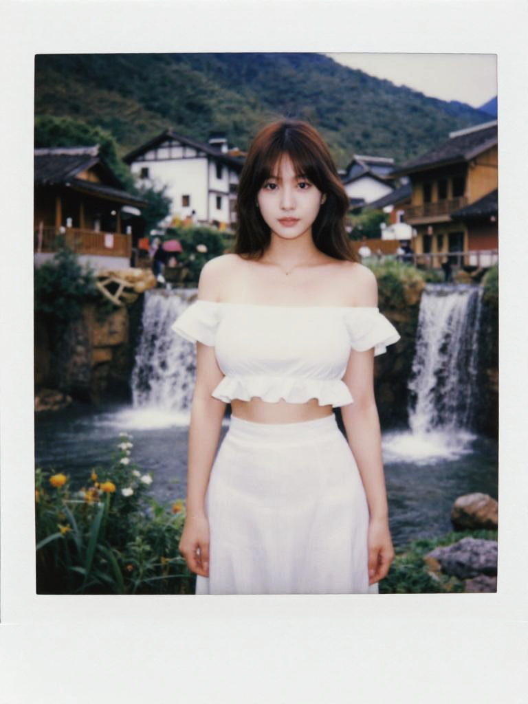A woman in a casual summer style, wearing an off-white smocked tube top and light wash frayed denim shorts, captured in the visual style of instant film, sitting at a riverfront seating with a picnic setup. Sexy. Pretty face and beаutiful eyes. Big breasts