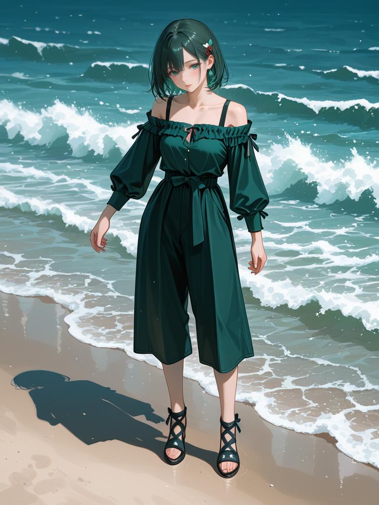 Full body digital artwork of a woman standing on a sandy beach with waves in the background. She wears a dark green off-the-shoulder top with long bishop sleeves featuring cut-out details tied with bows at the elbows, paired with black slim-fit pants that reach mid-calf. Her hair is styled in loose waves, adorned with hair clips, and she is wearing black open-toe sandals with criss-cross straps. The setting highlights a casual chic fashion style against the ocean backdrop.