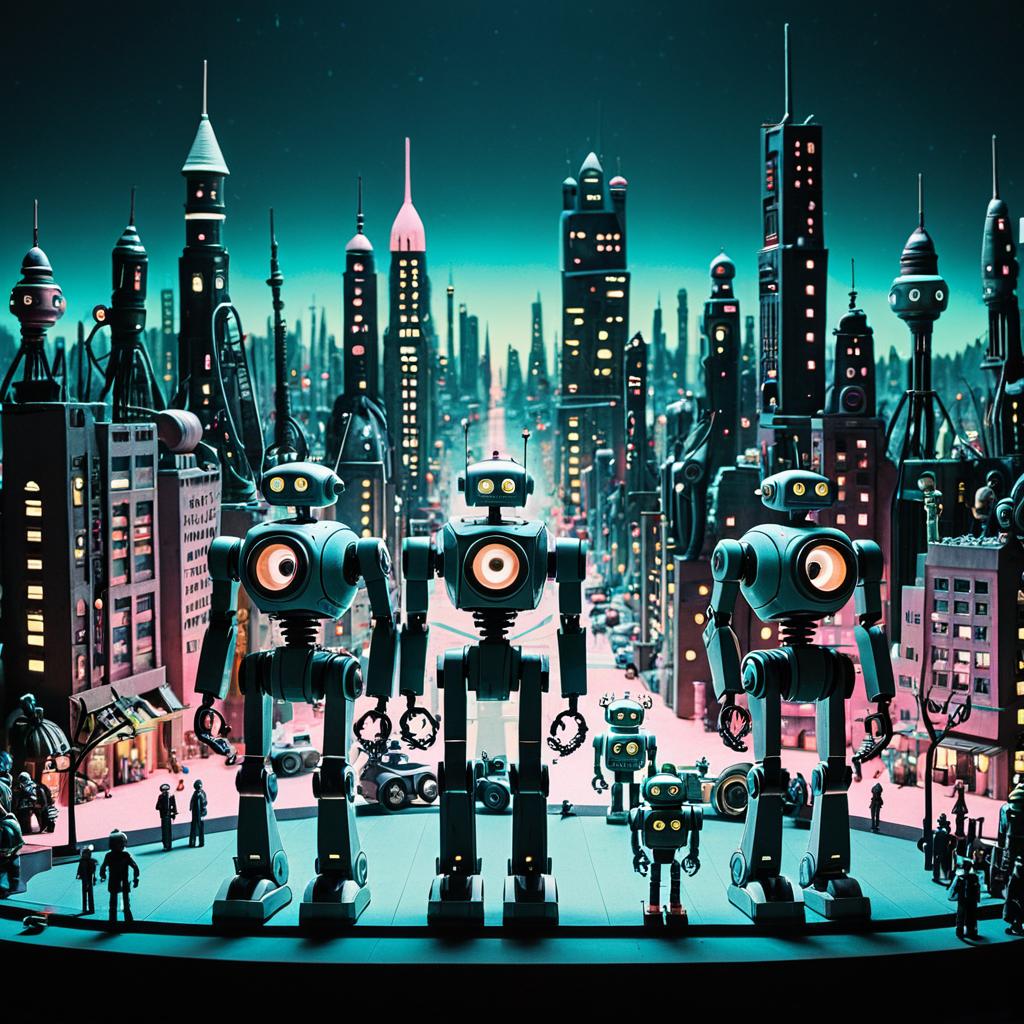 Vintage Futuristic Robots on Urban Rooftop at Night