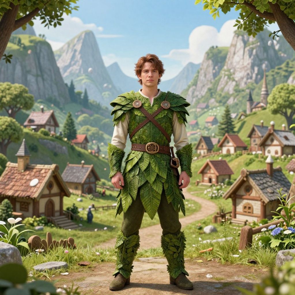 Photorealistic digital artwork of a young man with curly brown hair standing in a picturesque, medieval village. He wears a leafy, green, fantasy-style outfit with a brown leather belt, and his arms and legs are covered in large, textured leaves. The background features charming, brown-roofed cottages, lush green hills, and towering, rocky mountains under a bright blue sky with scattered clouds. The path he stands on is surrounded by vibrant flowers and greenery, creating a whimsical, fairy-tale atmosphere.