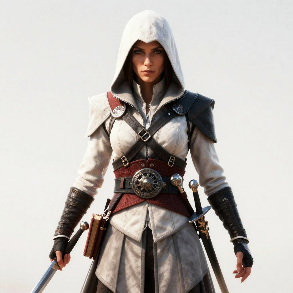 Assassins Creed Woman, woman in a hooded outfit with a sword and a book