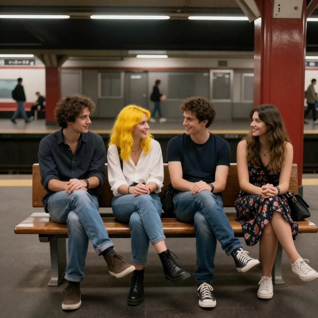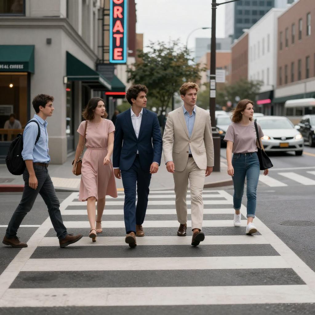 Photograph of a city street crosswalk. Six people walking, including a man in a blue suit, woman in pink dress, man in beige suit, and others in casual clothes. Neon sign, buildings, and cars in background. Overcast sky. Crosswalk lines in foreground. People crossing, some carrying bags. Pedestrian on left in motion.