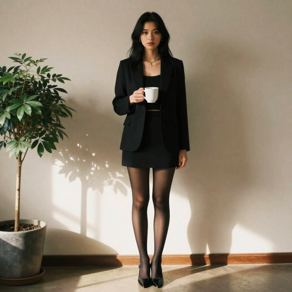 Photograph of a young woman with long black hair, standing against a plain white wall. She wears a black blazer, black mini dress, black sheer tights, and black high heels. She holds a white cup in her right hand. To her left, there's a potted plant with green leaves. Sunlight casts shadows on the wall and floor. She has a neutral expression and wears a simple necklace. The floor is wooden, and the wall is adorned with a wooden baseboard. The overall style is modern and minimalist.