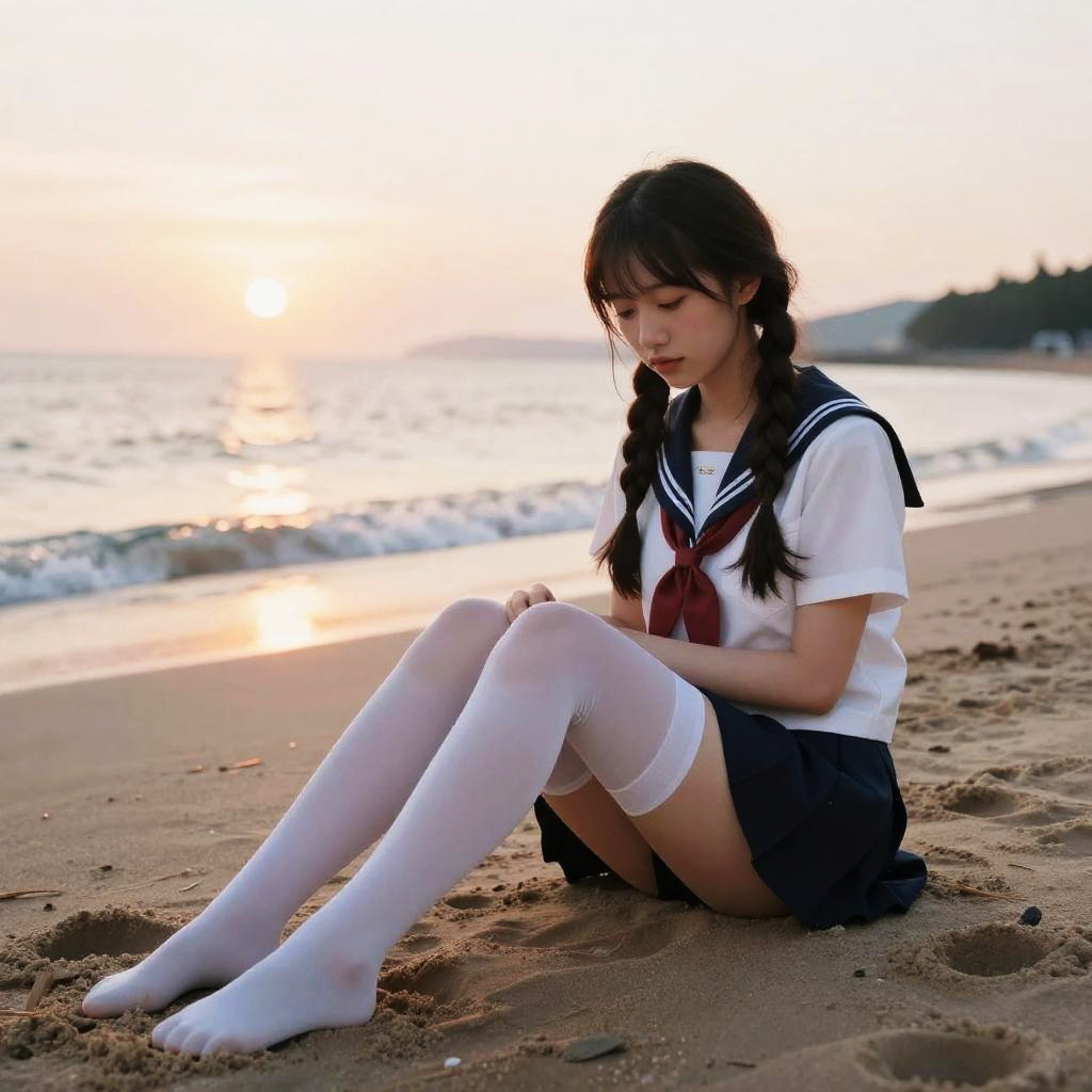 Over the sea, on the beach, lie, twin_braids, ultra detailed, incredibly_absurdres, best quality, highres, an extremely delicate and beautiful, beautiful detailed girl, 8k_wallpaper, masterpiece, sunset, (photorealistic:1.5), adjusting_thighhigh, sailor collar, white thighhighs
