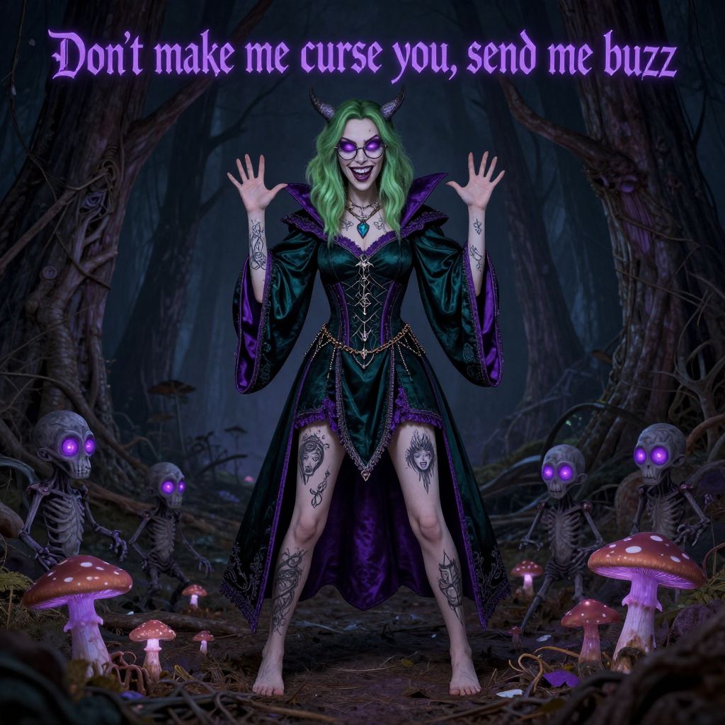 Digital artwork depicting a green-haired, pale-skinned woman with purple eyeshadow and black lipstick, standing in a dark, eerie forest. She wears a black, Gothic-style dress with intricate lace patterns, and her tattooed thighs are exposed. Her hands are raised with fingers spread, and she has a mischievous smile. Above her, in glowing purple text, it reads "Don't make me curse you, send me buzz." Surrounding her are small, purple-eyed, greyish humanoid creatures and glowing red mushrooms. The forest background is dark and twisted, enhancing the mystical, sinister atmosphere.