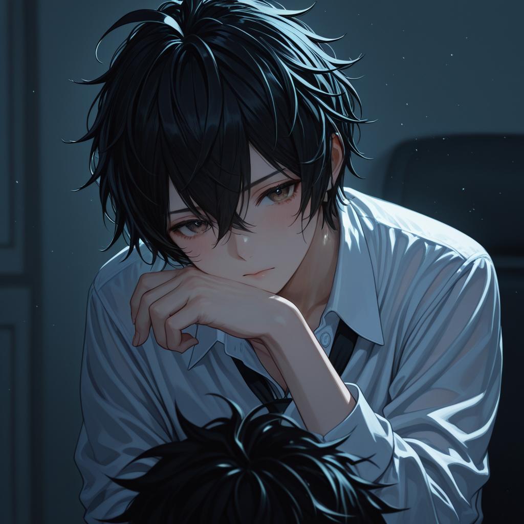 This digital anime-style drawing features a young man with tousled black hair and brown eyes, gazing pensively forward. He wears a slightly unbuttoned white dress shirt, revealing a hint of his collarbone. His left hand rests beneath his chin, and his right hand is partially visible. The lighting is dim, casting a blue hue over the scene, with soft highlights on his hair and shirt. In the background, there is a blurry dark shape, possibly a chair. The overall mood is introspective and melancholic.