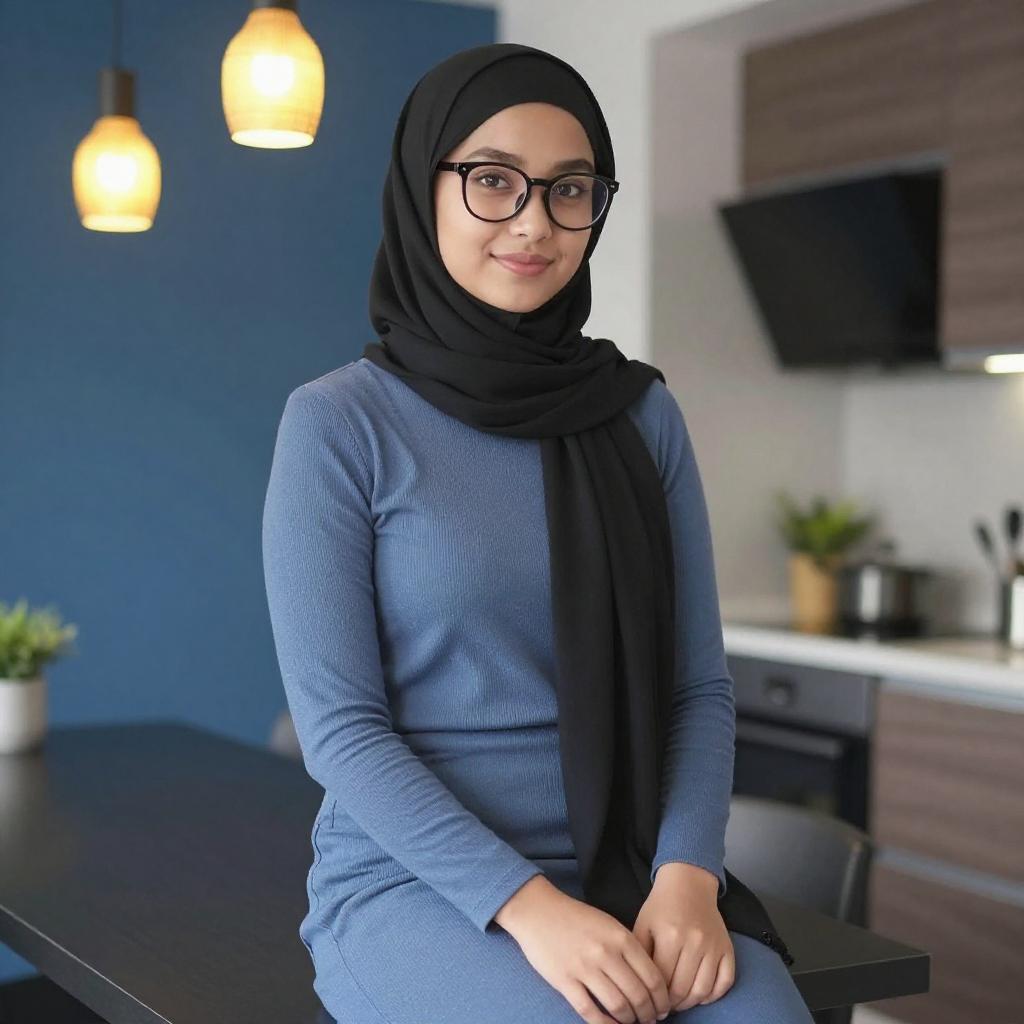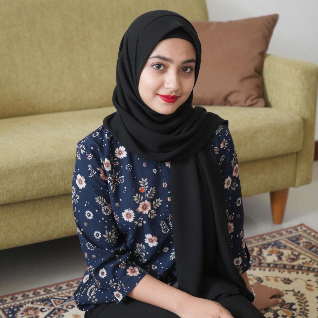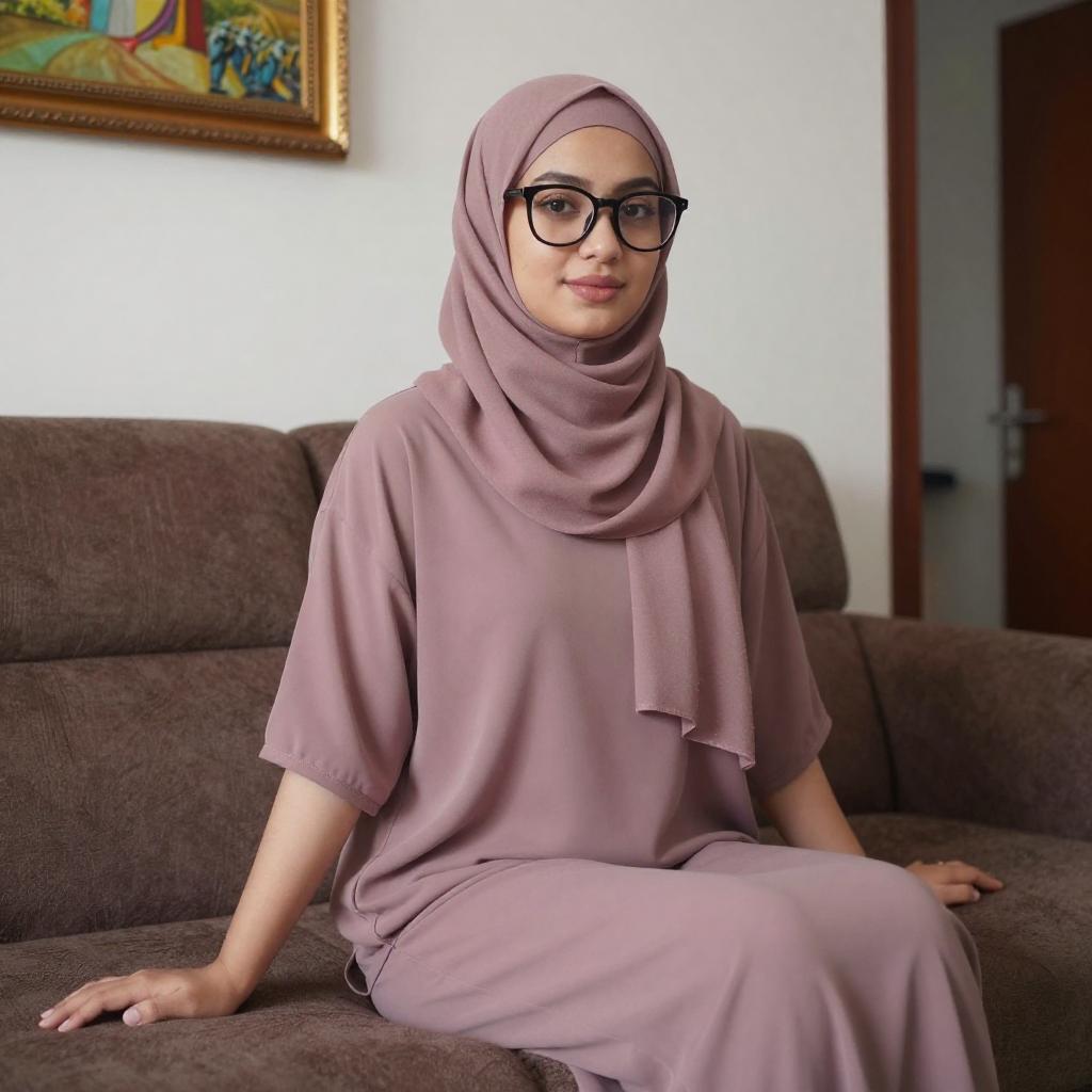 Photograph of a young woman with light skin and black-framed glasses, wearing a mauve hijab and matching outfit with a short-sleeve top and pants. She sits on a brown couch in a living room, her hands resting on the seat. The background includes a framed painting and a partially visible doorway.