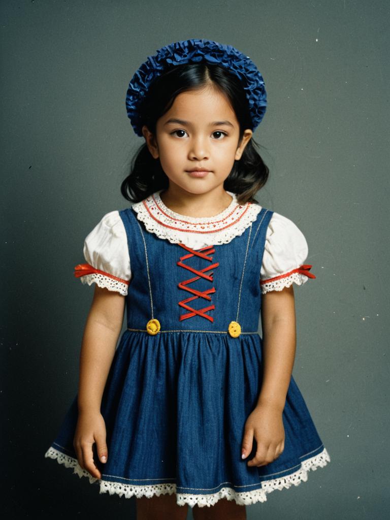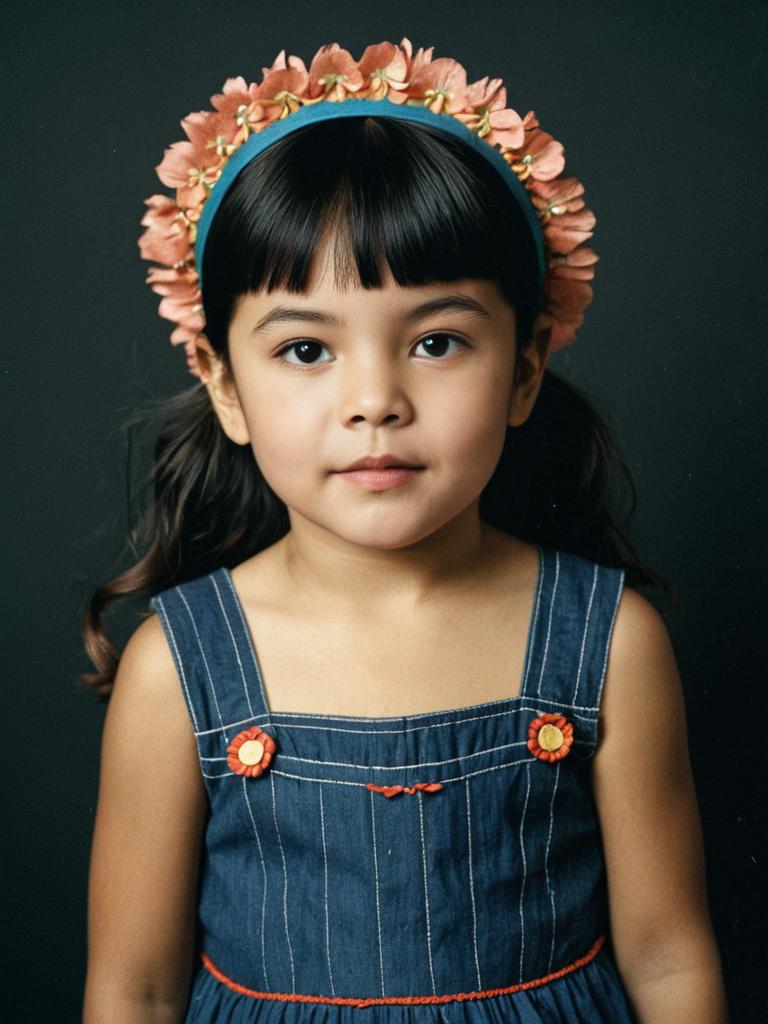 Photorealistic studio portrait of a young girl with dark hair styled in pigtails. She is wearing a blue denim Rosita costume dress adorned with small flower details and a matching floral headband. The background is solid and dark, emphasizing the subject's expressive eyes and serene facial expression.