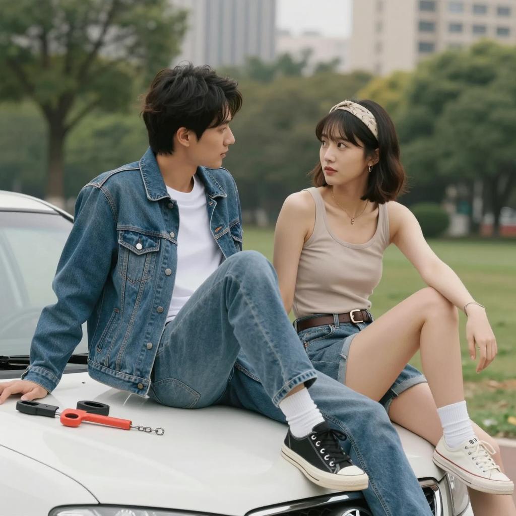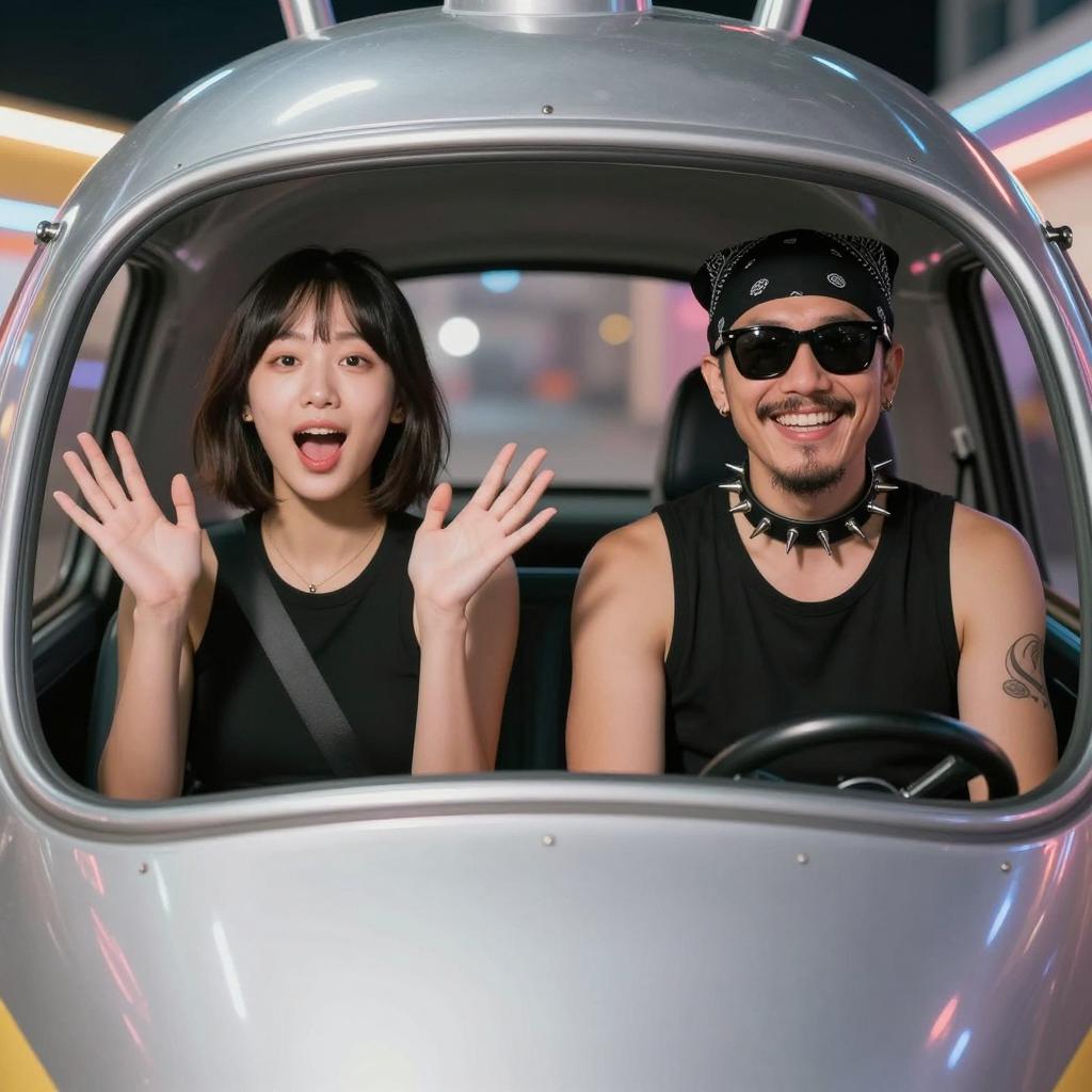 Two people inside a shiny, silver, spherical vehicle. The woman on the left has short dark hair, open mouth, and raised hands. The man on the right has a mustache, sunglasses, black bandana, and a spiked choker. Both wear sleeveless, ured black tops. Bright, colorful lights in the background. The man is smiling widely.