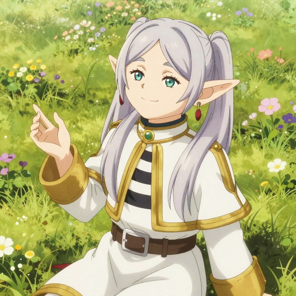 Frieren smile in a peaceful meadow, surrounded by blooming flowers and soft sunlight, graceful elf with a warm, inviting smile, wearing elegant robes, fantasy character portrait with rich colors and intricate details