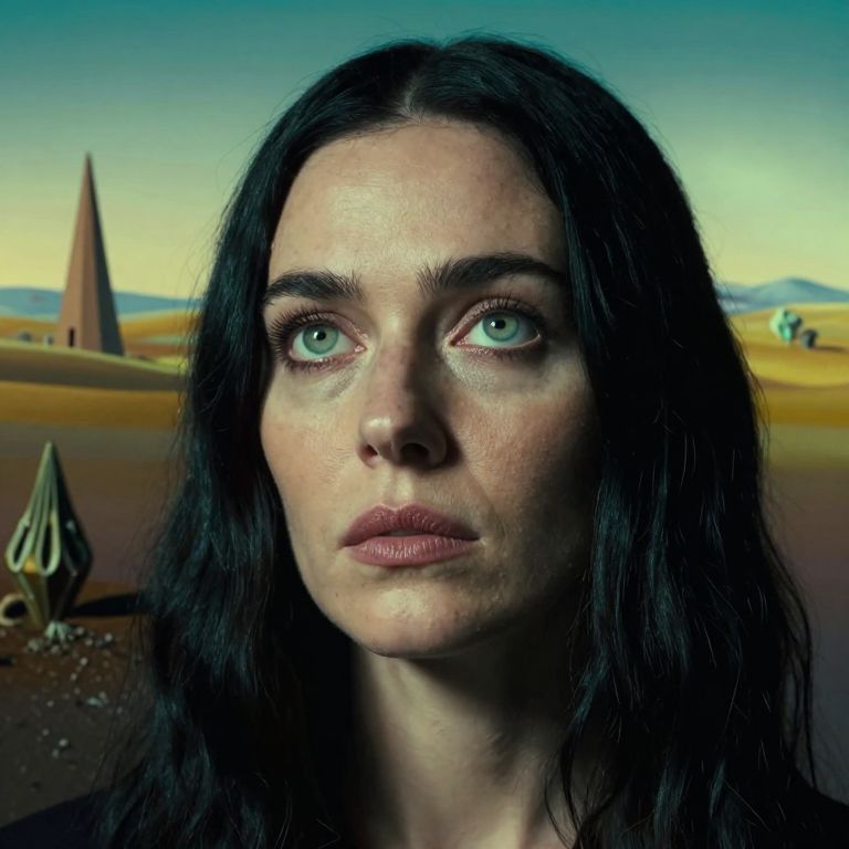 Craft a hyperrealistic portrait showcasing an enigmatic figure with captivating hazy green eyes and cascading raven hair, set against a surrealist backdrop reminiscent of Salvador Dali's landscapes. Captured from an unconventional low angle, this image explores her intense gaze piercing through layers of reality, evoking curiosity and unease simultaneously. The surrounding environment blends familiar organic shapes with geometric structures, creating an emotional gradient that prompts contemplation on perception and existence. This ultrarealistic portrait transcends the boundaries between illusion and truth, captivating viewers in a mesmerizing dance between reality and surrealism.