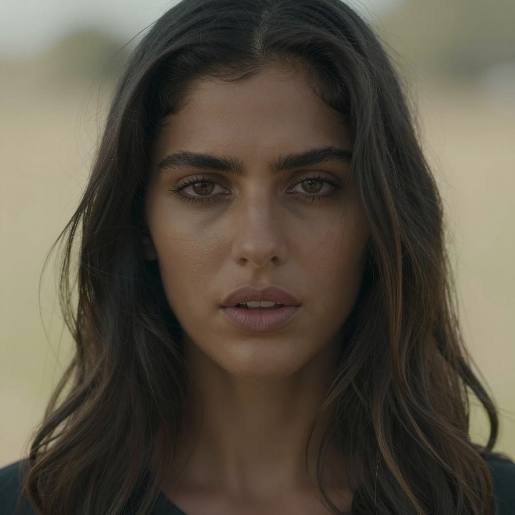 A woman with long, dark brown hair and green eyes, wearing a brown headband and a brown shirt. She is leaning against a rocky, ured surface with greenery in the background. Her intense gaze is directed at the camera.