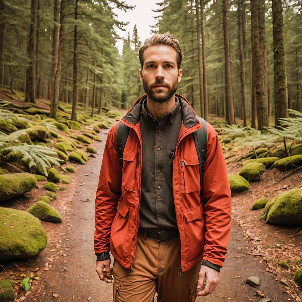 Photo of a muscular man, buzz cut, hiking outfit, wearing Oak Brown Tactical nylon cargo pants, Crimson Red Conduit stretch moisture-wicking shirt, Fog Grey Thermo fabric fleece jacket, hiking boots, desert mud, surreal test print