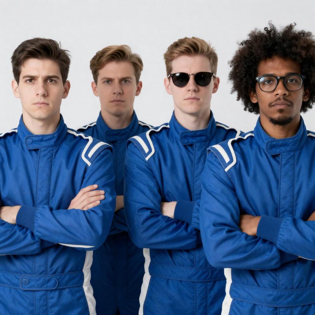 Photograph of two men in black suits. One man, white with short brown hair, stands behind the other, black with short curly hair. They lean against a dark brick wall. Both look to the right with intense expressions. Background includes pipes and a framed photo.