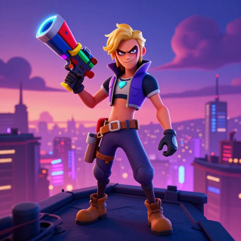 This digital artwork features a stylized, cartoonish character standing on a rooftop at sunset. The character has blonde hair, a muscular build, and wears a blue cropped jacket with a white undershirt, black gloves, and dark pants with a utility belt holding a small pouch. They hold a colorful, futuristic gun with glowing blue accents in their right hand. The character's expression is confident, with narrowed eyes. The background showcases a vibrant cityscape with pink, purple, and blue neon lights, and tall buildings. The sky is a gradient of purple and pink with a cloud. The overall style is reminiscent of modern digital animation, with bold colors and sharp lines.