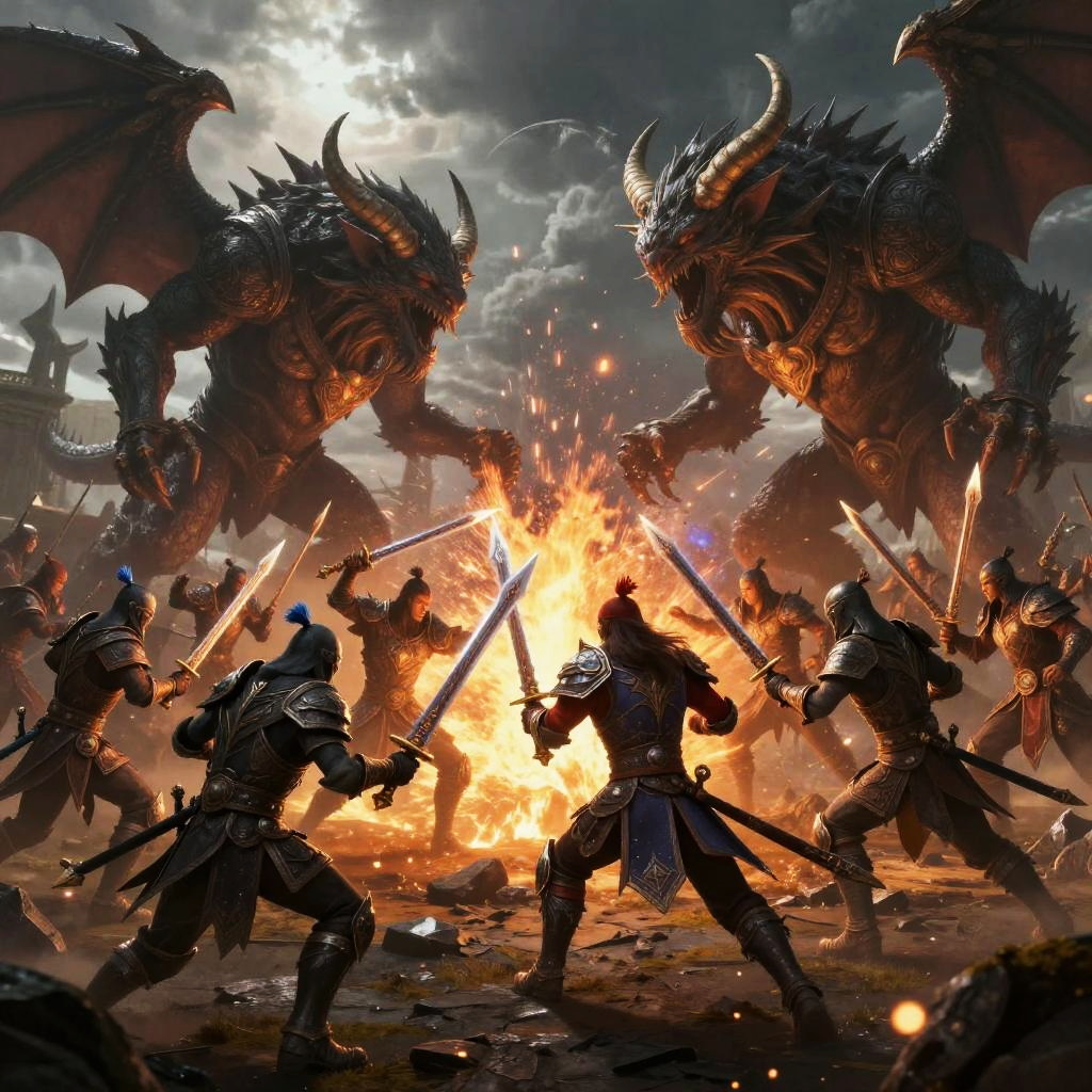 Mabinogi battle scene depicting a dynamic clash between warriors and mythical beasts, sparks flying from enchanted weapons, dramatic clouds overhead, rich colors and high detail capturing intense fantasy action