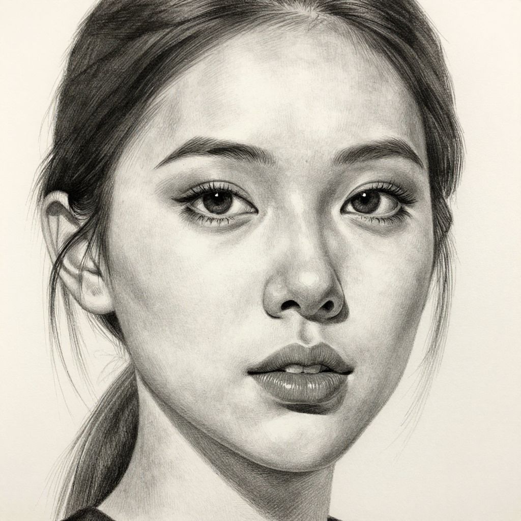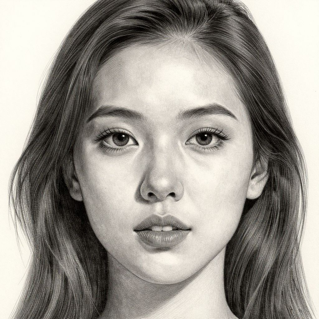 This is a highly detailed, black-and-white digital drawing of a young woman with a realistic style. She has long, straight hair that frames her face, dark eyebrows, and large, expressive eyes with slightly parted lips. Her skin is smooth, with subtle shading to indicate depth and dimension. The background is completely white, making her face the focal point. The artist uses fine, precise lines and varied shading to create a lifelike appearance. The overall texture is smooth, with a focus on realistic facial features and expressions.