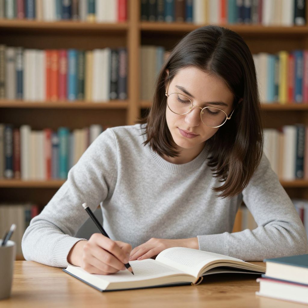 Woman engrossed in reading a book while surrounded by vibrant potted plants, colorful yarn balls, and a cozy library setting filled with neatly arranged books on wooden shelves.