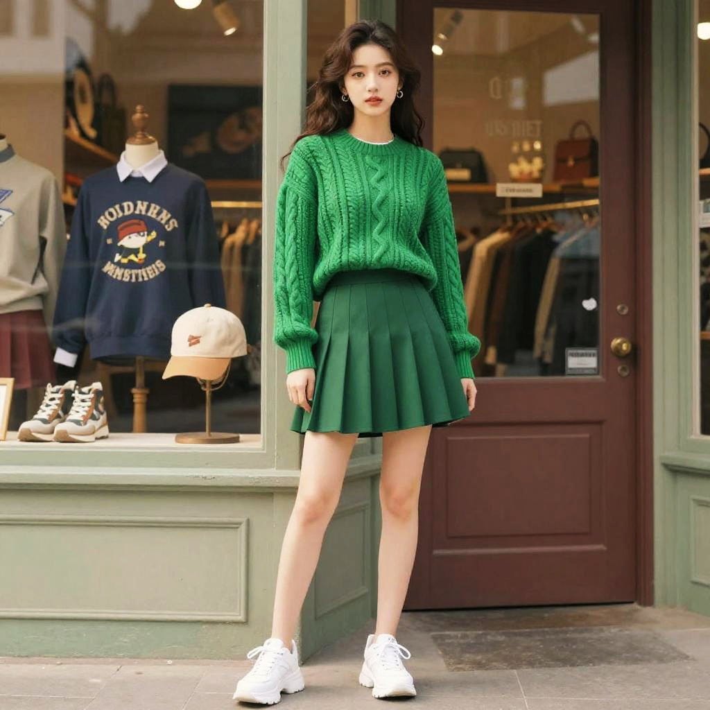 A Petite woman, sporty chic in a green cable knit sweater over a graphic T-shirt, pleated mini skirt, and white chunky sneakers, posed at a vintage boutique in a Victorian house, in the style of toei animation. Sexy. Pretty face and beutiful eyes
