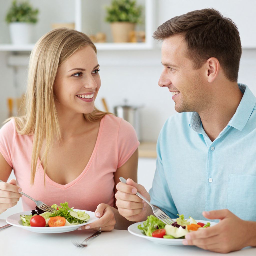 Photograph of a happy couple dining together in a bright, modern kitchen. The woman with blonde hair and a pink top smiles at the man with short brown hair and a light blue shirt. Both hold white plates with colorful salads and are using forks. The background is softly blurred with white shelves and greenery. The couple is engaged in a friendly conversation, creating a warm and relaxed atmosphere.