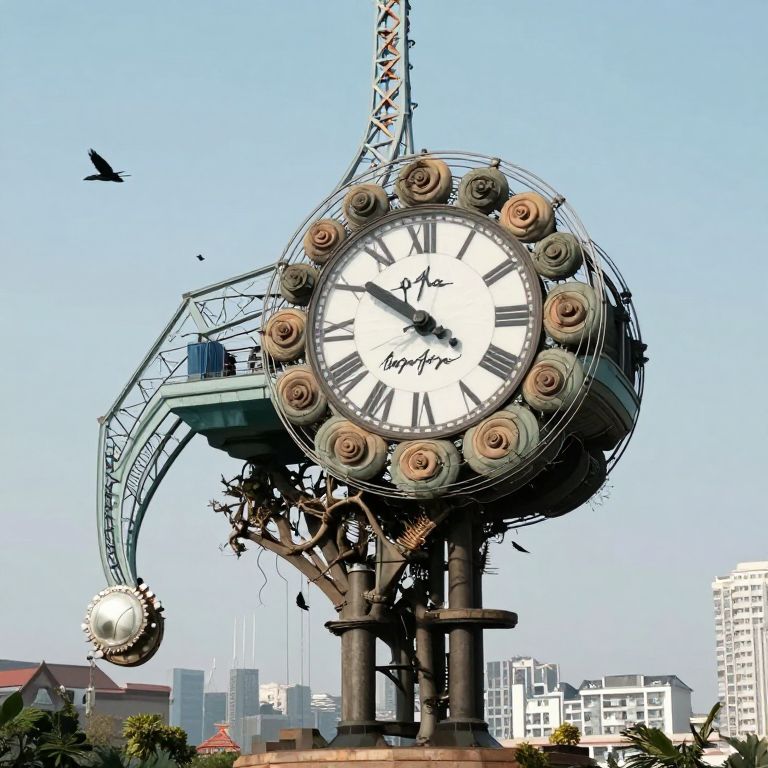 Photograph of a large, whimsical clock sculpture against a clear blue sky. The clock has a white face with black Roman numerals and black hands, surrounded by oversized, brown rose-like decorations. It is mounted on a rusted, industrial-style metal structure with a curved arm extending to the left, holding a smaller, spherical object. A black bird is flying in the sky to the left. In the background, there are modern white and glass buildings, and some greenery at the bottom. The clock's design is steampunk-inspired, blending industrial and vintage elements.