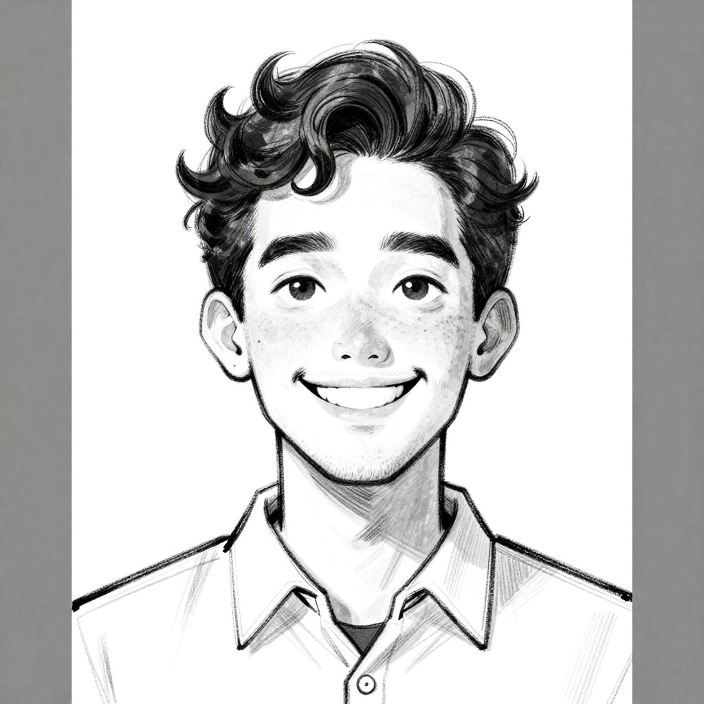 This is a black and white digital sketch of a smiling man with curly hair, light stubble, and expressive eyebrows. He's wearing a collared shirt, and the lines are clean and slightly textured, giving a cartoonish yet realistic feel. The background is plain white, and there's a gray border on the left and right edges of the image.