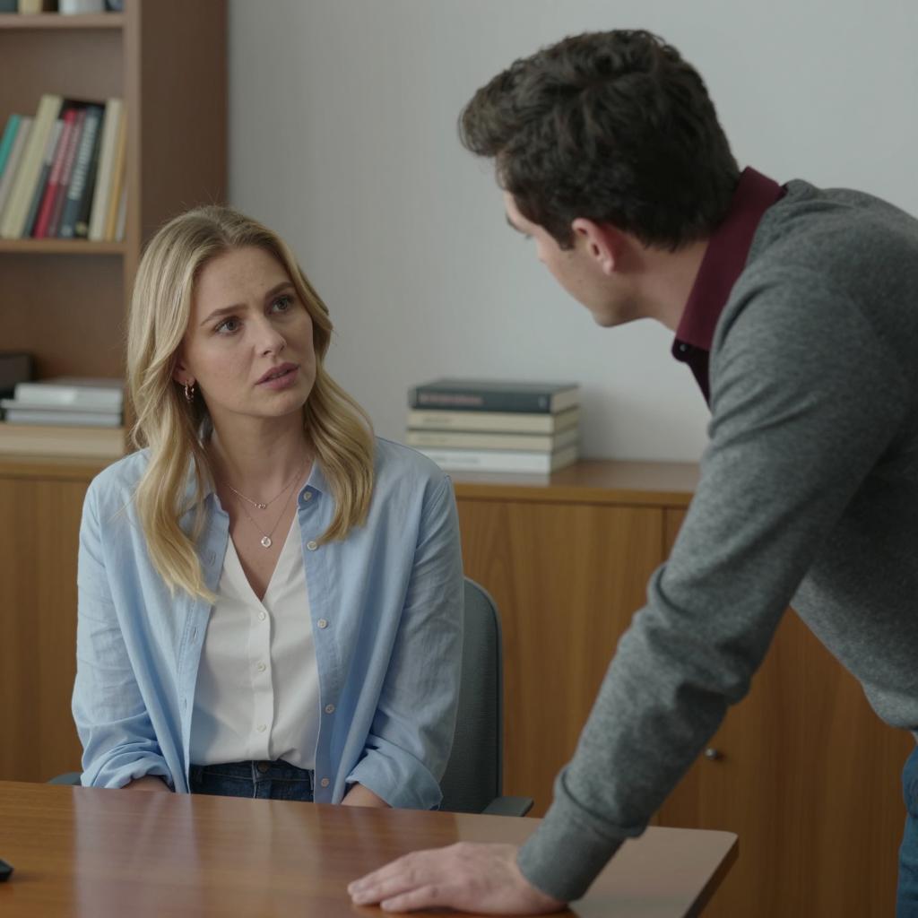 Woman with glasses, brown hair, black velvet robe, white shirt, gray tie, white earring, sitting at desk. Child with curly red hair, plaid shirt, red scarf, holding pen, sitting in chair behind her. Desk with papers, files, computer, vase with purple flowers, beige wall, abstract artwork. Woman looking to left, child looking forward. Warm indoor lighting.