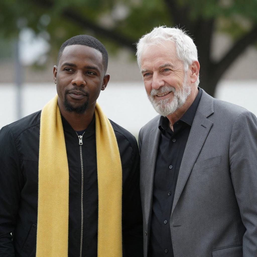 Photograph of an older white man with white hair and a beard, wearing a gray suit and black shirt, leaning towards a younger black man with dark skin and short hair, dressed in a black jacket and yellow-striped scarf. They are outdoors, with a blurred background of green trees and white light. The older man is smiling, while the younger man looks slightly to the side.