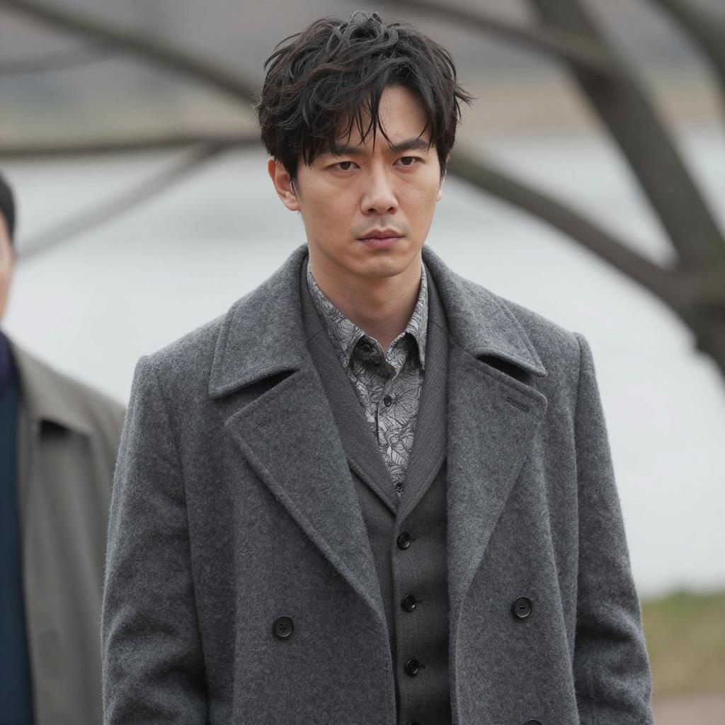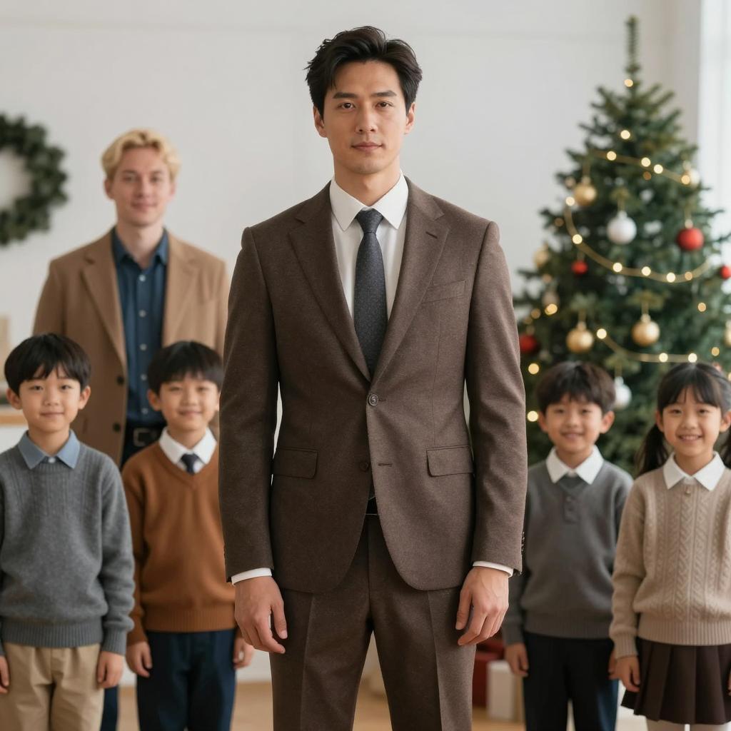 Portrait of an Asian man with dark hair wearing a brown suit and gray tie standing at the center indoors. Behind him are six smiling children dressed in sweaters and collared shirts, along with a blonde man in a tan coat. A decorated Christmas tree with lights and ornaments is visible to the right, creating a warm festive atmosphere.