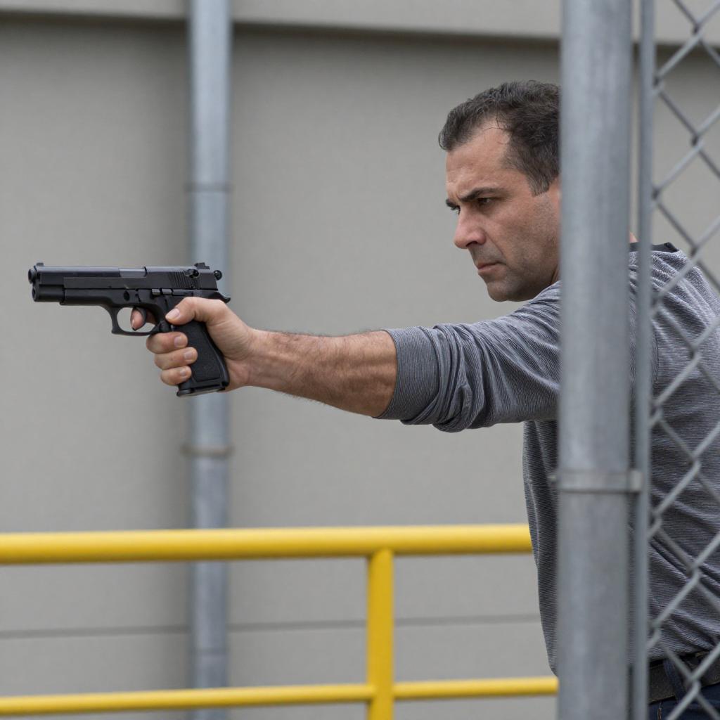Photograph of a middle-aged man with short, dark hair, wearing a gray, striped shirt, holding a black handgun, peeking through a chain-link fence with a tense expression. Background includes a gray, industrial wall with metal pipes and a yellow safety bar. The man's right arm is extended, gripping the gun, while his left arm is partially hidden behind the fence.