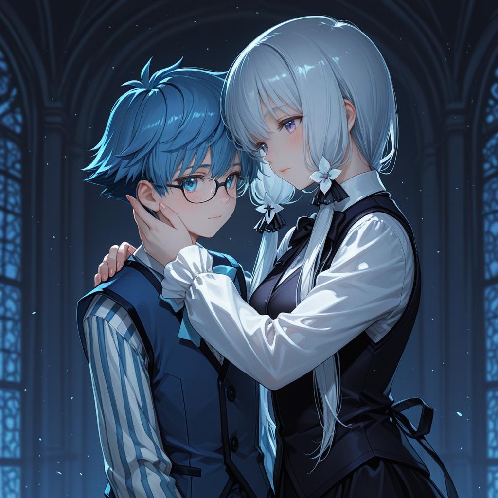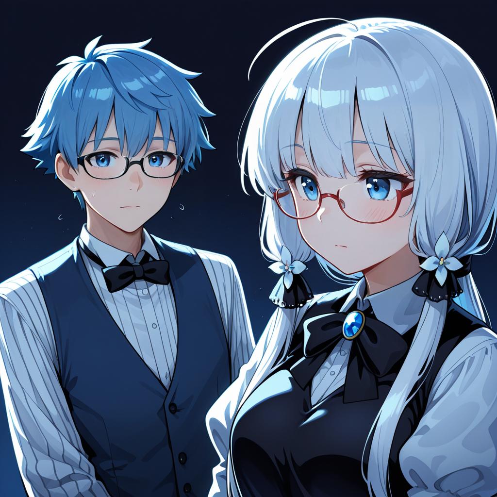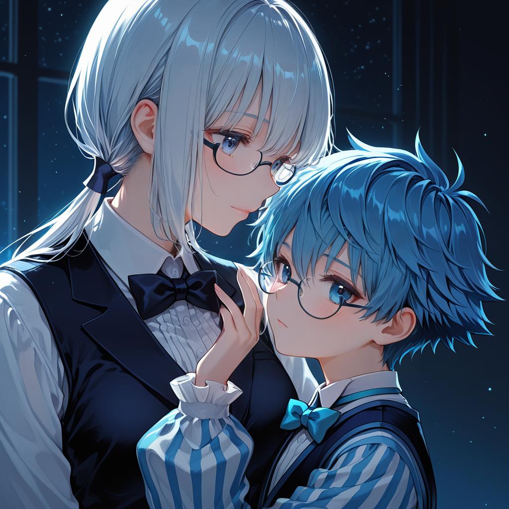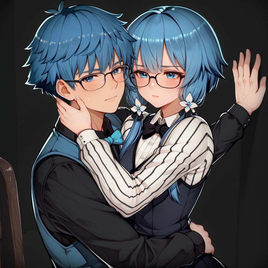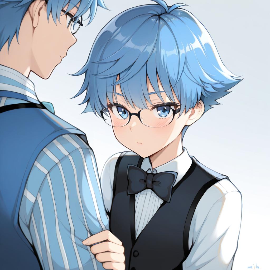 Hans christian andersen (fate), fate (series), 1boy, blue eyes, glasses, blue hair, short hair, vest, long sleeves, bowtie, by artist nishida megane, illustrious