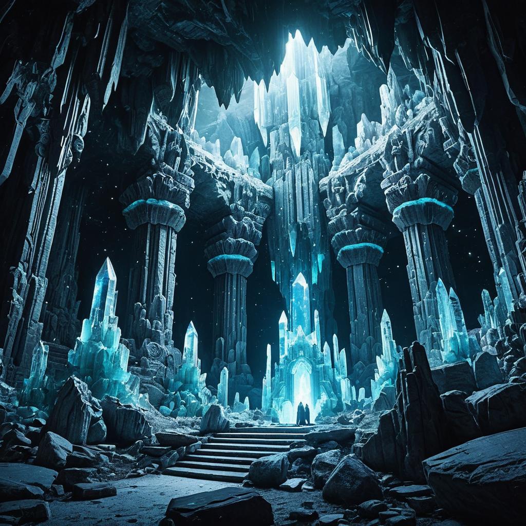 A breathtaking fantasy scene of a crystal cavern illuminated by soft ethereal glows from luminous quartz stalactites and stalagmites. The cavern features ancient gemstone temples intricately carved from quartz, with towering pillars and detailed rock formations under a starlit astral sky. The image conveys a mystical and cinematic atmosphere with ultra-detailed visuals.